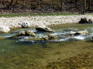 Une bonne quarantaine d’ombres sont venus frayer sur le nouveau tracé de Chaley (et frayent encore), après les frayères à truites de cet hiver. On distingue, pour les yeux avertis, les traces blanches laissées par les poissons. Un spectacle qui laisse indifférent les chamois qui ont pris l’habitude de venir brouter le trèfle semé l’année dernière après les travaux.