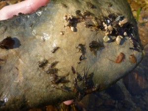 Les débits permettent de soulever quelques pierres et de comprendre que les éclosions massives ne sont pas loin, qu’ils s’agissent des éphémères ou des mouches de mai enfouies dans les limons.